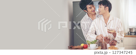 Banner Happy gay couple enjoy breakfast in kitchen drinking coffee. Panorama Two best friends LGBTQ relation partner home cooking. Wide Happiness romance homosexual marriage lifestyle with copy space