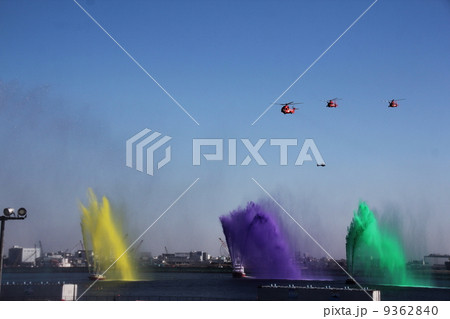 在新年慶典上,消防員們同時向藍天進行水柱噴射訓練。