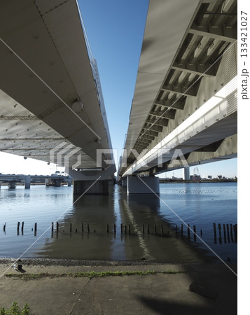 橫跨多摩川的大石橋巨大橋樑主樑的底部以及排列在水面上的樁基。