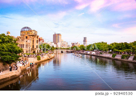 廣島 8 月 6 日是原子彈爆炸的日子。原爆圓頂和元安橋周圍的風景。舉行紀念燈籠儀式。