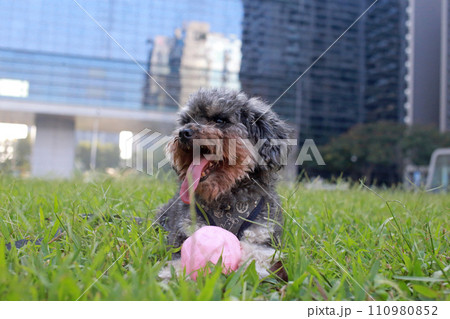 戶外公園夏天陽光明媚的下午,隨地吐痰可愛的柴犬,積極性查詢1件幸運午餐