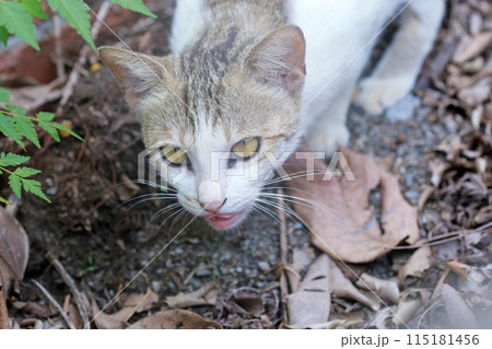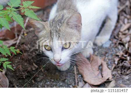 拍攝戶外一隻貓咪吐著舌頭好奇地看著鏡頭