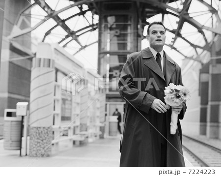 A visionary businessman uses binoculars on a tree lightbulb in the city.