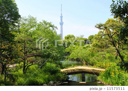 [東向島,東京] 秋天從向島百花園的池塘對面的木橋和東京晴空塔的景色。