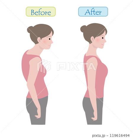 具有不良姿勢(駝背)(例如捲肩和河馬肩)的女性與具有正確姿勢的女性的前後對比。
