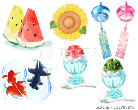 夏季節日向量插圖集。向日葵、西瓜、章魚燒