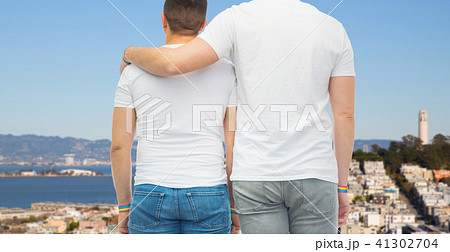 male couple with gay pride rainbow wristbands