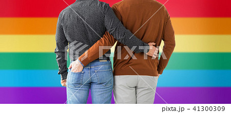 close up of hugging male gay couple over rainbow