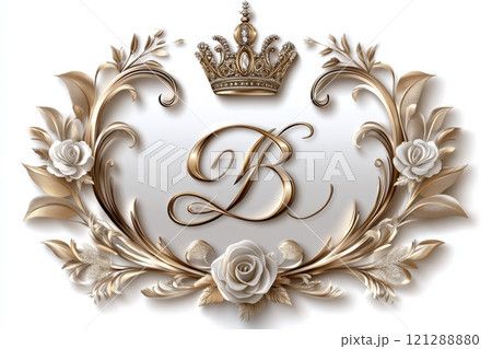 Golden Crown Above Stylish Letter B Surrounded by Roses and Ornate Floral Motif. Combination of Gold and White Accents. Luxurious and Elegant Design. AI generated