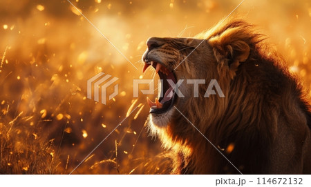 Powerful lion roars majestically in the vast savanna, asserting dominance over its territory, Ai Generated.