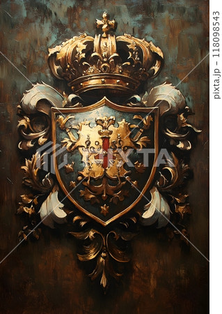 Ornate Heraldic Crests Regal Coat of Arms Gilded Insignia in Dramatic Lighting