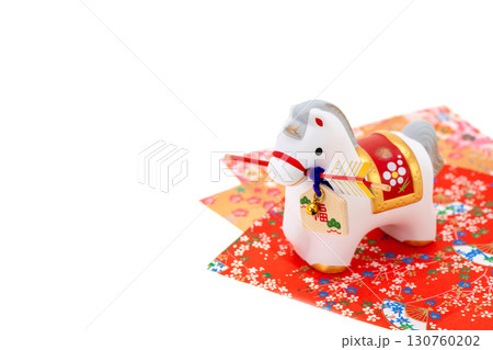 馬年新年素材:紅色背景手持箭矢和梅花花瓣的白馬