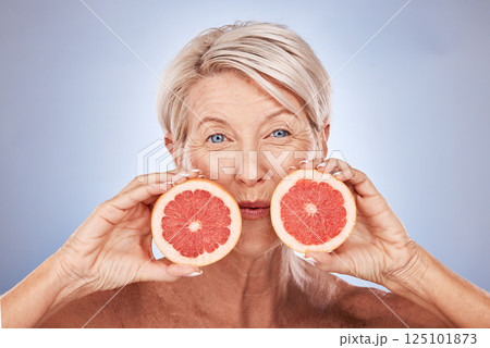 Natural, portrait and senior wellness with grapefruit for skin, beauty and aging treatment. Skincare, mature and health model for vitamin c fruit cosmetic advertising with gray studio mockup.