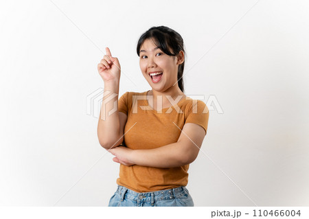 The cheerful young Asian woman has great thought, finding inspiration or solutions to solve a problem. pointing finger up standing on white background.