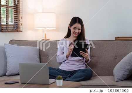 Attractive Asian woman resting comfortable living room and using digital tablet, Relax, Sofa, Lifestyle