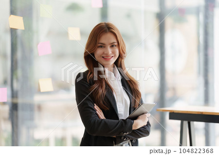 Portrait of Happy asian business woman with laptop computer in office. Woman in suit at office