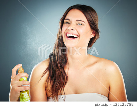 Woman, spray and hair care beauty for shine, healthy and glow texture in care bottle. Smile portrait, happy and oil cosmetic protection product with confident girl model in dark studio background