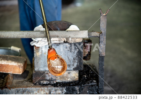 在薩摩切子玻璃工廠使用玻璃吹製剪刀進行造型