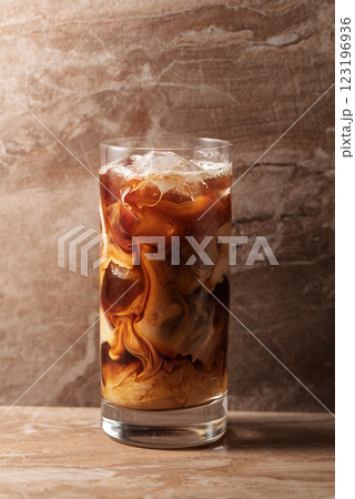 Cold brew coffee mixing with milk and ice cubes in tall glass