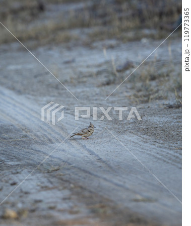 Crested lark or Galerida cristata bird on ground or forest trail during winter season safari at Tal Chhapar Sanctuary churu Rajasthan India