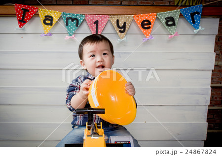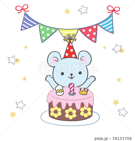 小老鼠快樂的過他的生日,背景有旗幟做裝飾