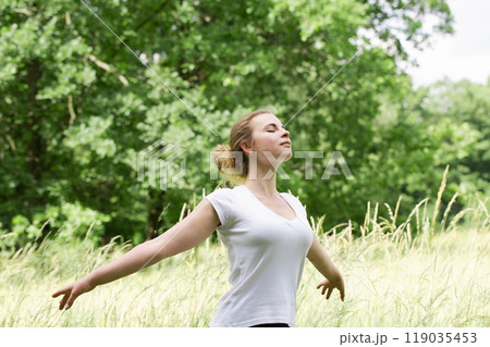 A woman rests in nature with her arms outstretched, the concept of emotional balance