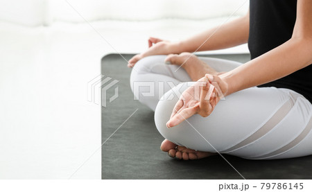 Woman doing yoga meditating exercise at home, sitting in Lotus position or Padmasana with mudra in bedroom. Healthcare concept..