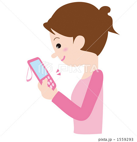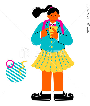 一幅色彩鮮豔的流行插畫,描繪了一位女學生站立操作智慧型手機的場景