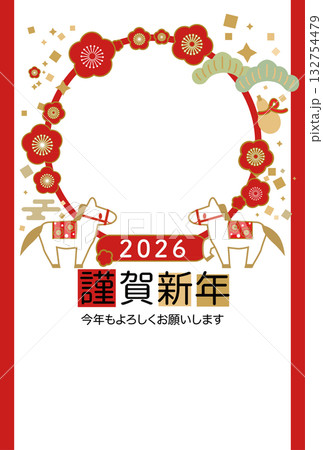 2026 年馬年新年賀卡插圖(日式圖案背景上有兩匹馬和一個紅色圓圈)
