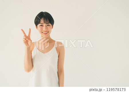 一個女人用雙手做和平標誌,白色背景