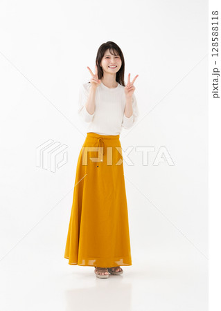 全身插圖:一位身穿褲子的年輕女子微笑著做出和平手勢