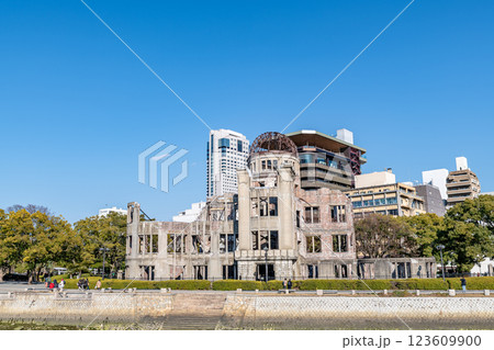 是和平公園標誌性的原子彈穹頂和世界遺產遊輪的風景。請欣賞深藍色的秋天天空的景色。廣島
