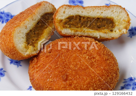 咖哩麵包的橫切面。裡面塞滿日式咖哩的炸麵包。