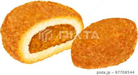 咖哩麵包在砧板上切成兩半,麵糊流出