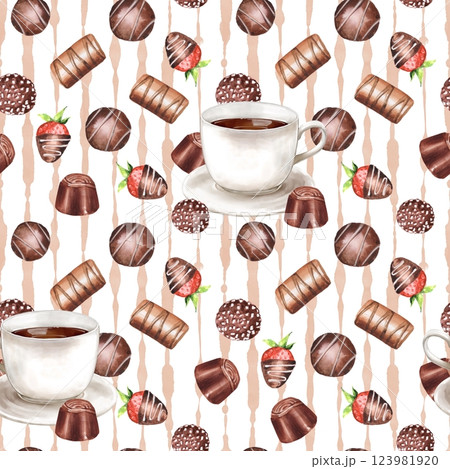 Chocolate candies and cup of coffee, watercolor seamless pattern. Hand drawn sweet background.