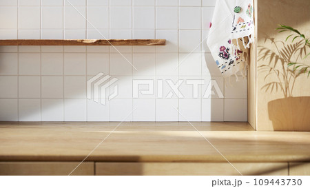 A sunny kitchen with white tile walls, a wooden table and sink.
