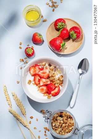 Granola or muesli with natural greek yogurt, strawberry and honey in a bowl on a blue background