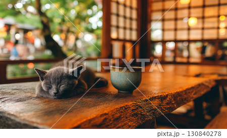 番茄工作法學習時間,舒緩的陽光和咖啡杯,以及一隻橙色的貓在木製咖啡桌上舒適地睡覺
