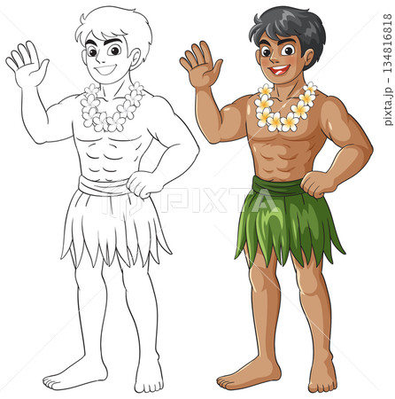 Smiling Hawaiian Boy in Grass Skirt Waving Hand