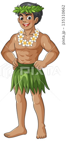 Smiling Hawaiian Man in Traditional Grass Skirt and Lei