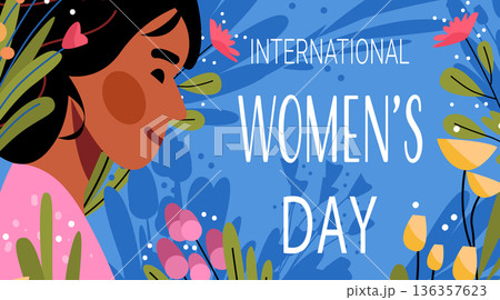 8 March womens day woman portrait flowers celebration blue background floral decoration modern banner