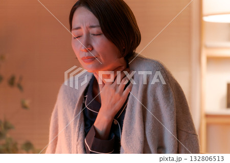 冬夜,中高級婦女在客廳摀著喉嚨