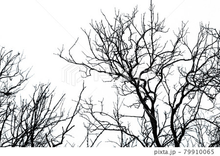 Silhouette dead tree on white sky background for a peaceful death. Despair and hopeless concept. Sad of nature. Dead branch unique pattern. Halloween night abstract background. Leafless tree.