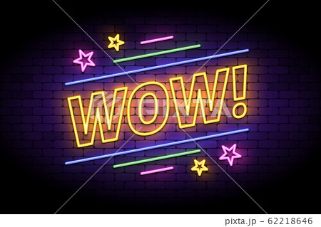 Wow label in glowing neon style on a brick wall.