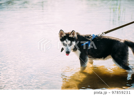 Cute siberian husky puppy dog play with water outdoors on the beach near lake at sunny summer weather