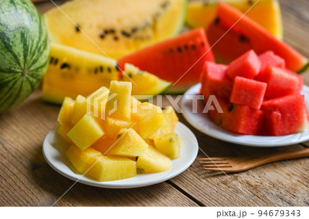 Closeup sweet watermelon slices pieces fresh watermelon tropical summer fruit, Red and yellow watermelon slice on plate and wooden background