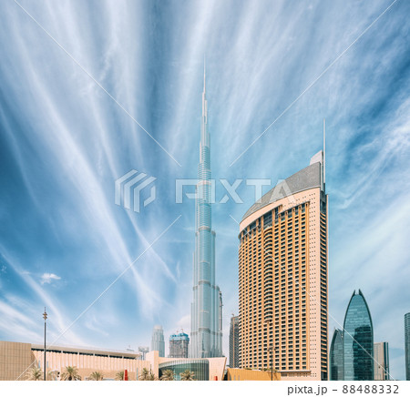 View of hotel Address Dubai Marina, Dubai mall and Burj Khalifa against dramatic sky. View of landmarks of residential district in Dubai Marina. Burj Khalifa, known as the Burj Dubai with a total