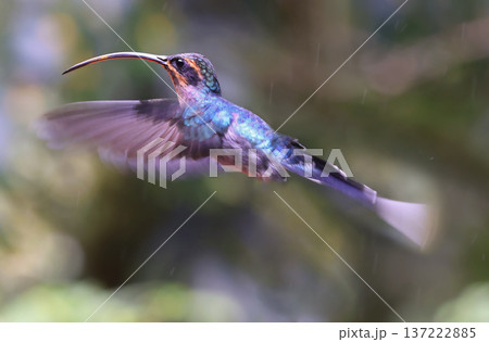 Violet Sabrewing Hummingbird flying in the forest, Costa Rica