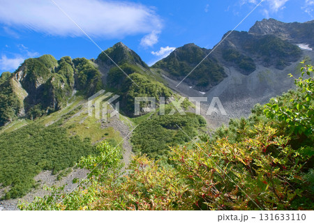 北阿爾卑斯:通往唐澤冰鬥的路上的秋色。遠處的花楸樹、大天上山、東大天上山。