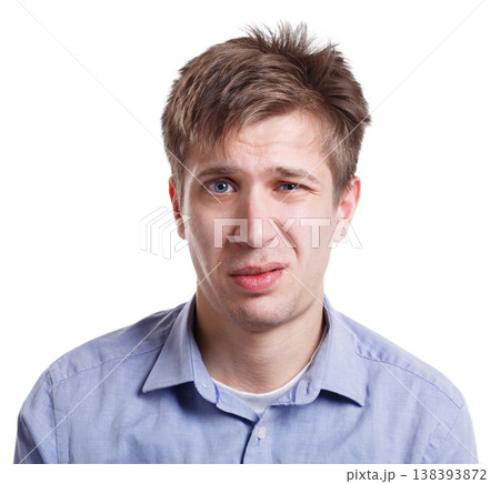 Disappointed. Negative emotion. Man with sad face, grimacing on white studio background, cutout